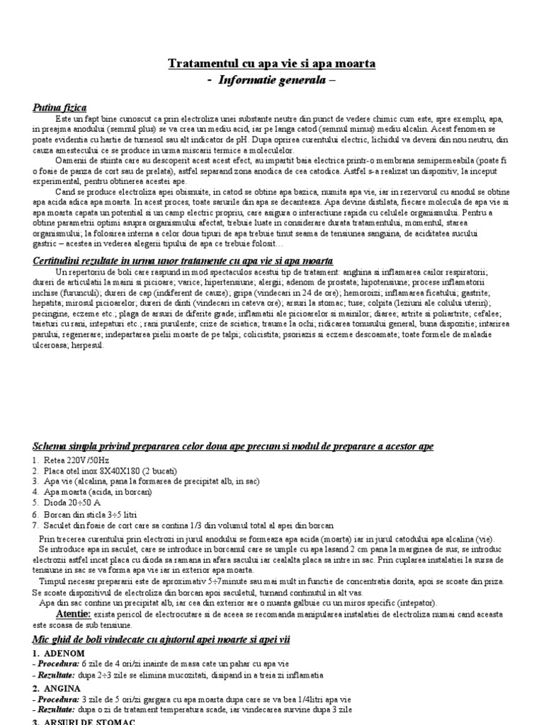 We are a sharing community. Aparatul este util celor grav bolnavi,datorita proprietatilor vindecatoare,diferite,ale. Ceea ce erau cândva basme, ca în „harap alb, au devenit acum realitate. Terapia cu apă vie şi apă moartă constă în utilizarea celor două produse rezultate din electroliza apei apa vie (negativă) consumată de oameni determină dezvoltarea ţesuturilor sănătoase şi însănătoşirea celor vătămate, iar dacă e consumată de către animale se înregistrează o rapidă. Apa vie dă tinerețe veșnică și vigoare, iar cea moartă vindecă rănile.