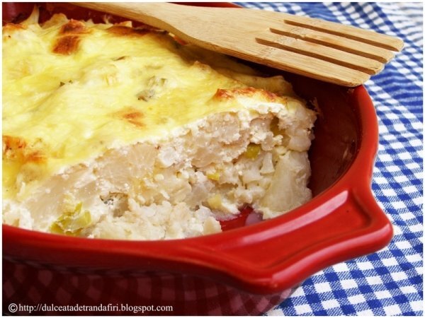 Puneți tava în cuptor încălzită la 200 de grade. Curatam frunzele si cotorul conopidei si o desfacem in buchetele mici, egale. Asezam conopida in tava si printre buchetele, punem bucatile de branza, deasupra punem smantana amestecata cu incalzim cuptorul la 170° grade celsius si punem conopida in cuptor pentru circa 35 minute. Chiar și cei care, de obicei, nu mănâncă deloc conopidă, găsesc că această conopidă la cuptor este cel puțin interesantă dacă nu chiar delicioasă. Puneți forma în cuptorul preîncălzit la 180 de.