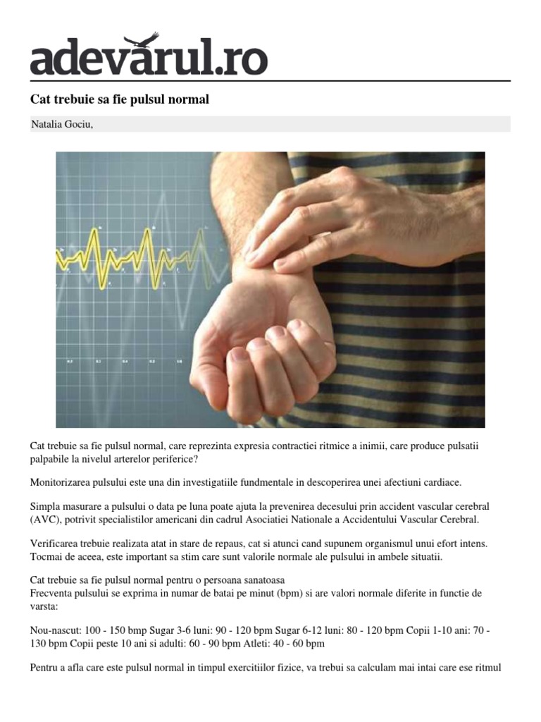 Cat Trebuie SÄ Fie Pulsul Normal Cum PoÈi Detecta Problemele De SÄnÄtate Source from : https://playtech.ro/despre/cat-trebuie-sa-fie-pulsul-normal/ Recomandat ar fi ca presiunea dvs. Generalitati pulsul reprezinta expansiunea ritmica a arterelor sanguine care se comprima pe un plan osos si reflecta numarul de batai ale inimii care au loc pe parcursul unui minut. Pentru a masura pulsul mai usor, numara bataile timp de 15 secunde, apoi multiplica rezultatul cu 4. Noaptea, când dormim, și toate funcțiile sunt la un nivel bazal, atunci. Valori normale ale tensiunii arteriale sunt următoarele: