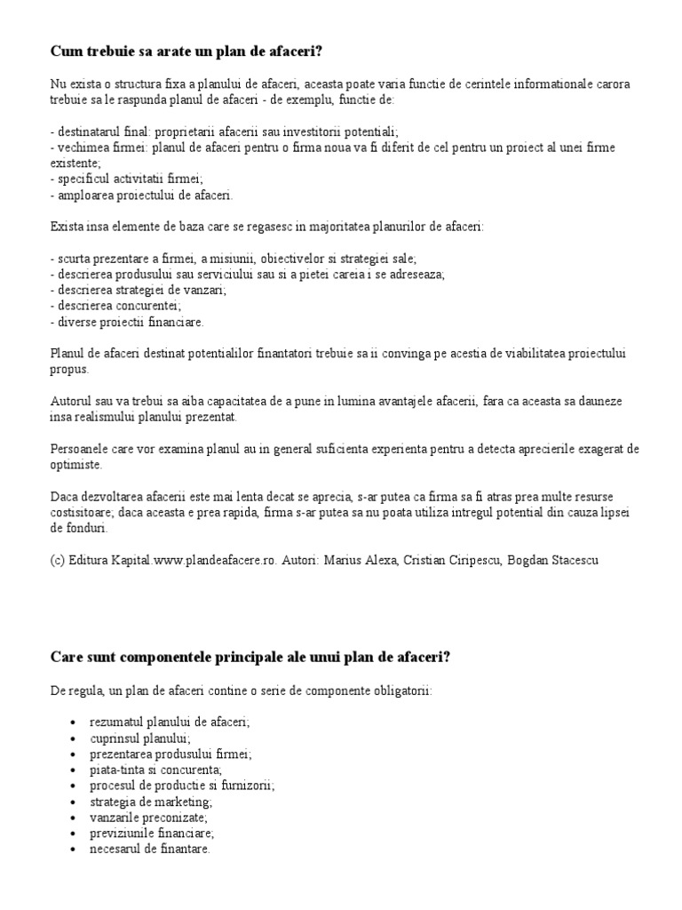 vizitati articolul complet aici : https://paginiromanesti.ca/2013/05/31/cum-sa-concepem-un-plan-de-afaceri/ In functie de specificul afacerii, unele capitole pot fi comasate sau eliminate. Cand ai un plan de afaceri stii care sunt principalele repere in cresterea afacerii tale si astfel poti verifica daca te afli sau nu pe directia corecta. Planul de afaceri este un instrument de planificare ce are rolul de a oferi o mai mare vizibilitate asupra țelurilor și evoluției unei anumite afaceri căreia îi este dedicat.